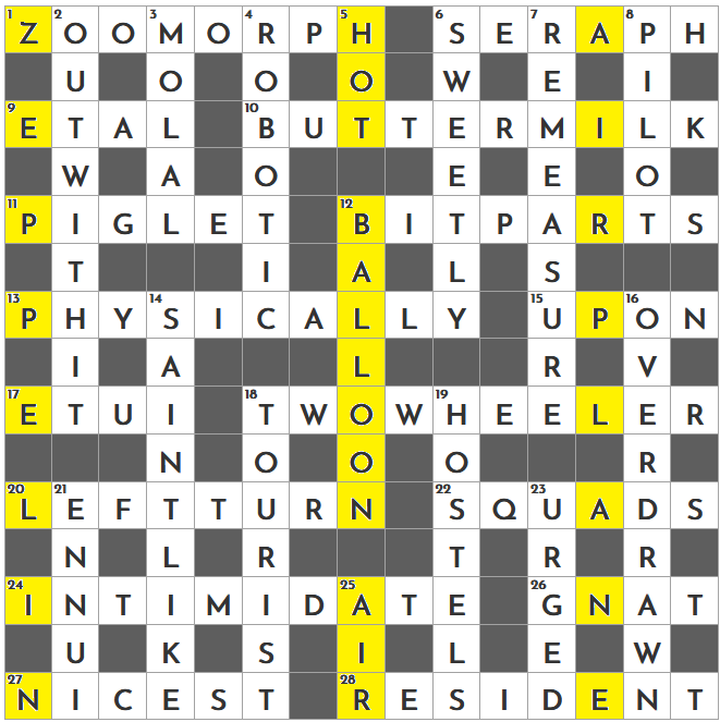 ReplyDeleteEnjoyed the crossword - BUTTERMILK, TWO-WHEELER (my COD), OVERDRAWN, BIT PARTS, URGED were a few favs. Got the ninas too (for a change!) ZOOMORPH was the last one in.